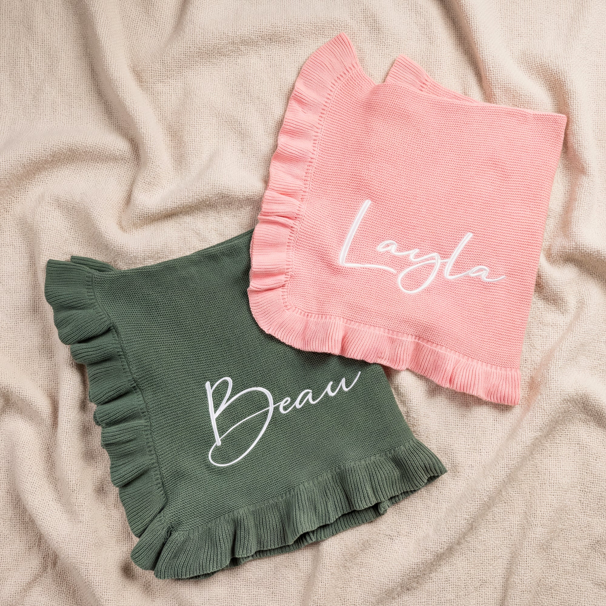Wrap your little one in comfort and love with our beautifully personalized knitted baby blanket. With a delicate ruffled edge and your baby’s name custom embroidered, this cozy cotton blanket is perfect for nap time, stroller walks, nursery cuddles, or a timeless keepsake 💕